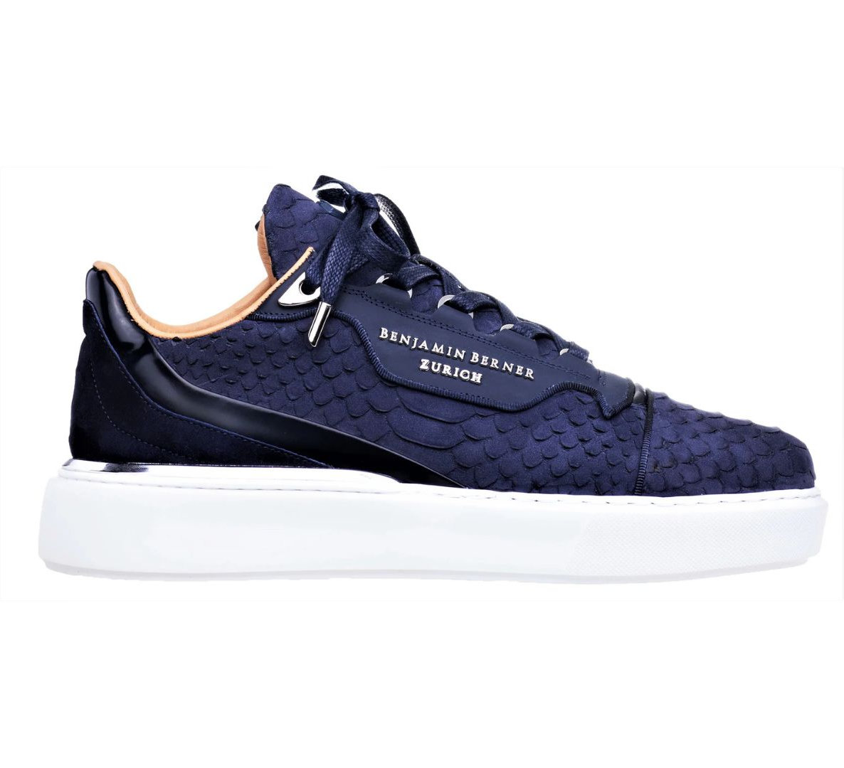 – Muške niske tenisice – 100% ručni rad – Izrađen tradicionalnim tehnikama rukotvorina s najboljim umijećem izrade – Podstavljeni ovratnik i jezik – Jezik s utisnutim logotipom – Najkvalitetniji gornji dio od teleće kože od talijanskog pitona – Ultra meka podstava od pune teleće kože – Metalne ušice – Kožna zakrpa s logotipom Benjamina Bernera – Vezice obložene pamukom – Ekskluzivni dizajn potplata od prave gume crne boje s utisnutom petom marke puzzle pattern bottom – Visoko udoban jastučić od memorijske pjene za podupiranje stopala, smanjuje udarce pete – Brendirana vrećica za prašinu i dodatne vezice uključene – Odgovara pravoj veličini